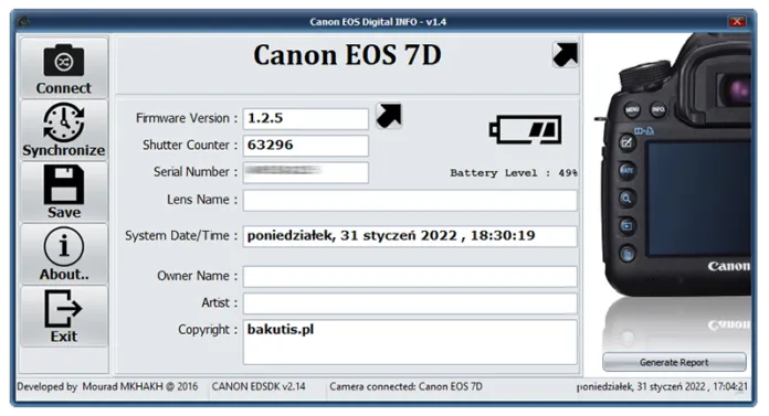 Jednym z najprostszych sposobów na sprawdzenie przebiegu w aparatach Canon jest użycie darmowego oprogramowania EOSMSG. Po podłączeniu aparatu do komputera, program wyświetli dokładną liczbę wykonanych zdjęć. To narzędzie jest kompatybilne z większością modeli Canon.Jeśli nie masz dostępu do komputera, możesz spróbować ręcznie sprawdzić przebieg w menu aparatu. W niektórych modelach, takich jak Canon EOS 5D Mark IV, informacja ta jest dostępna w sekcji "Informacje o aparacie".